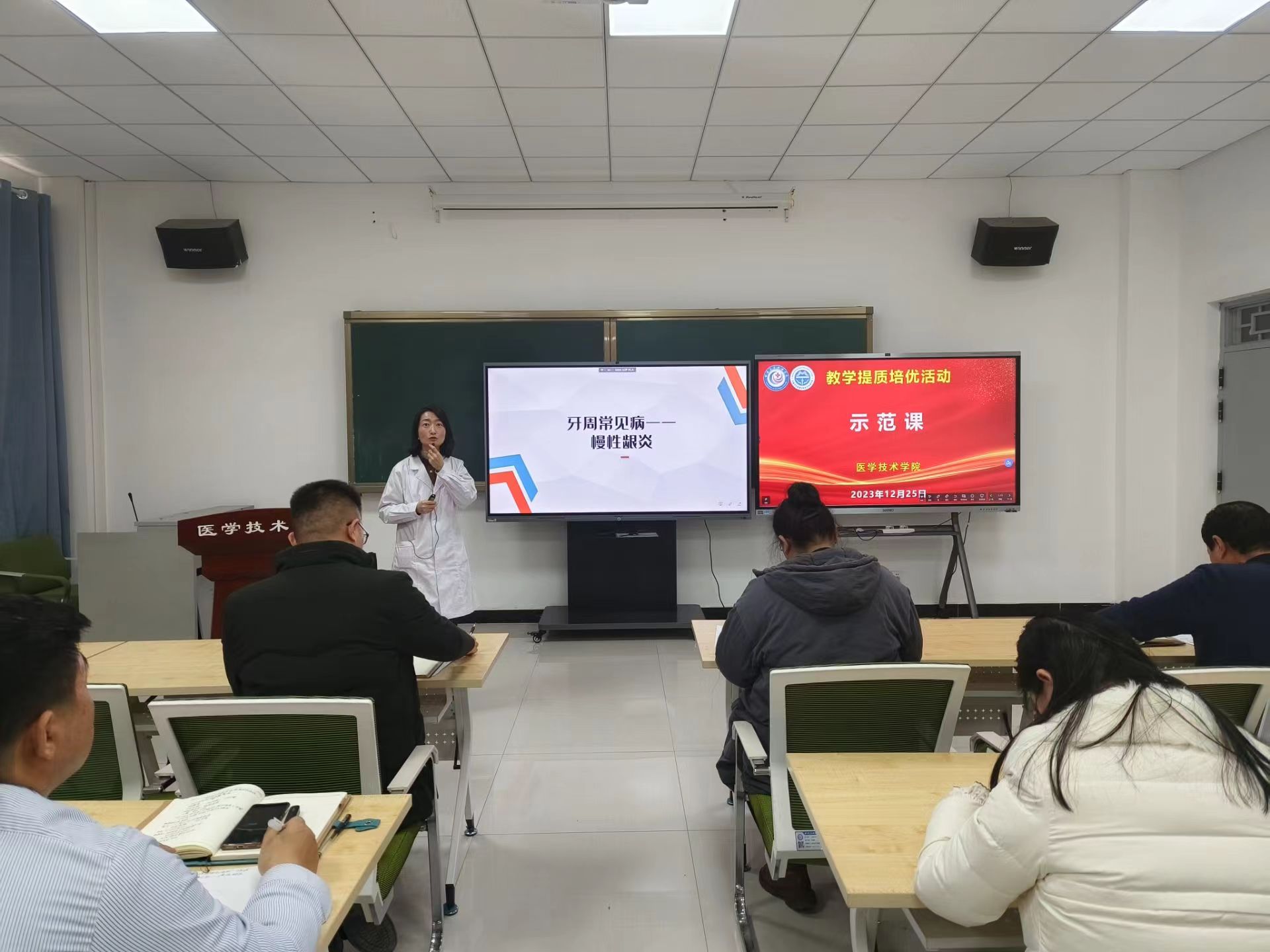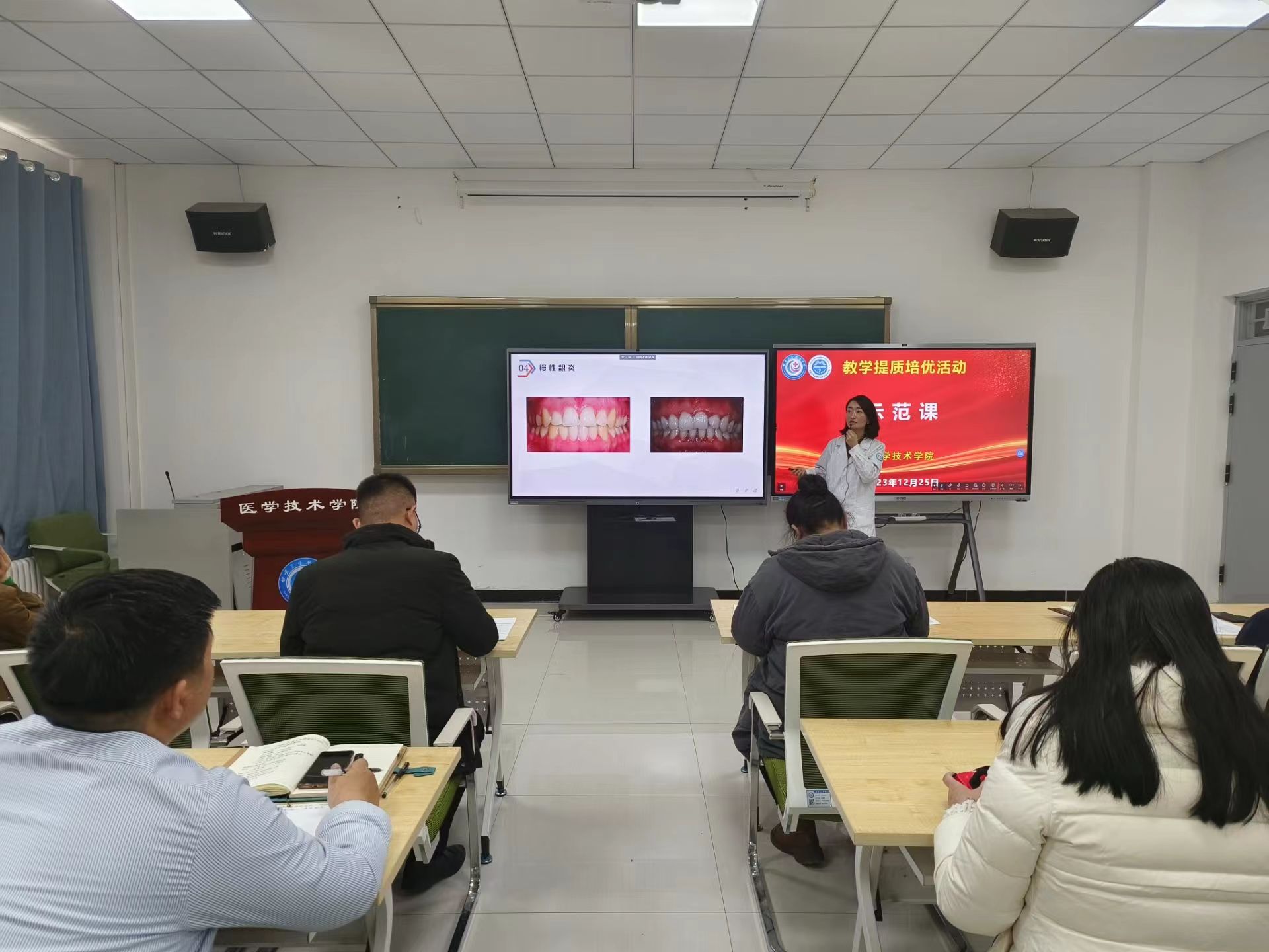 12月25日13:50学院举办教学提质培优活动—示范课,由马晓丽老师主讲题为“牙周常见病—慢性龈炎”的示范课。