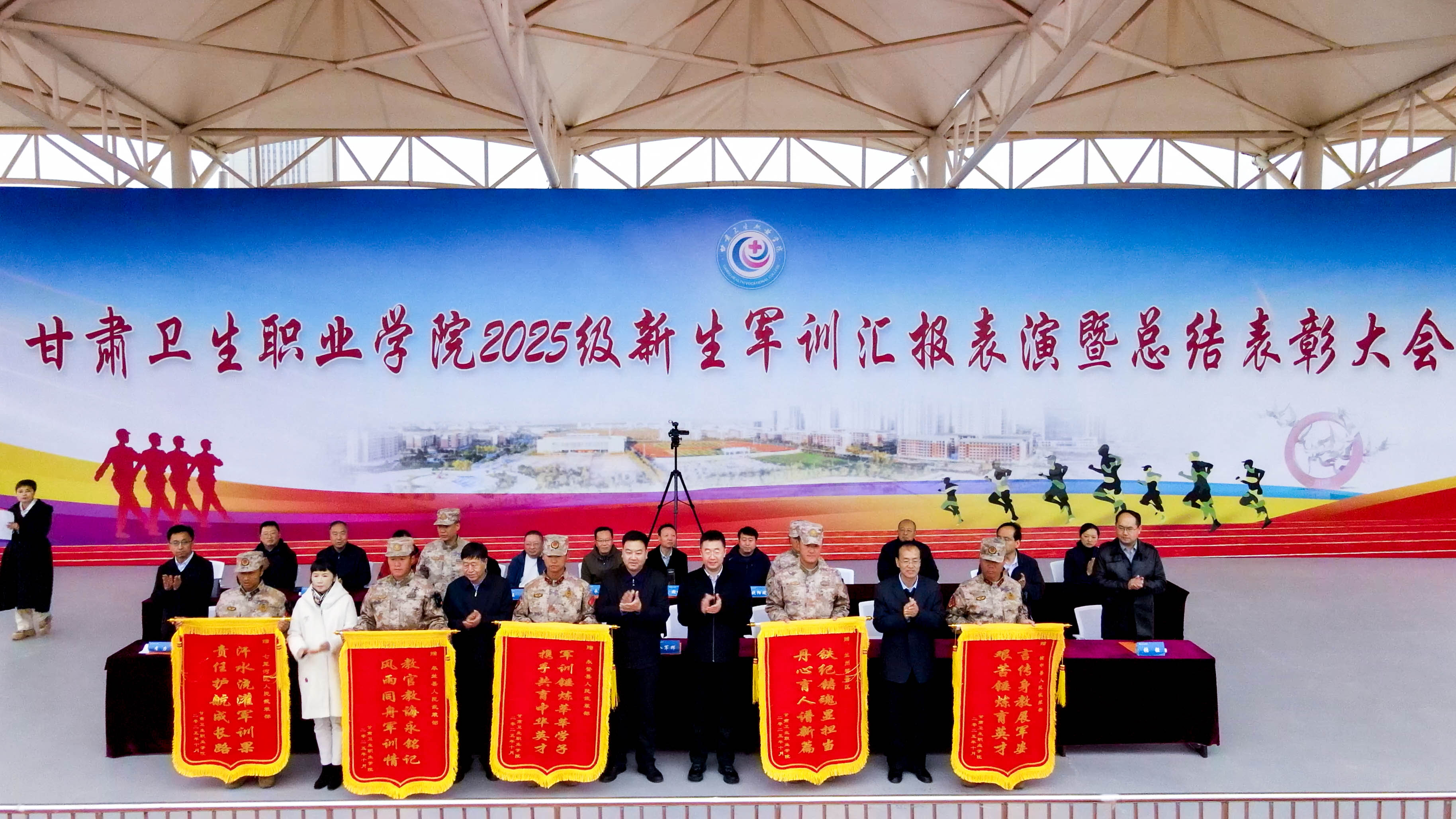 会上宣读了《关于表彰2025级学生军训优秀教官、优秀方队和优秀学员的决定》。校领导为优秀连队代表、优秀学员代表颁发荣誉证书,并为兰州警备区及承训武装部赠送锦旗。