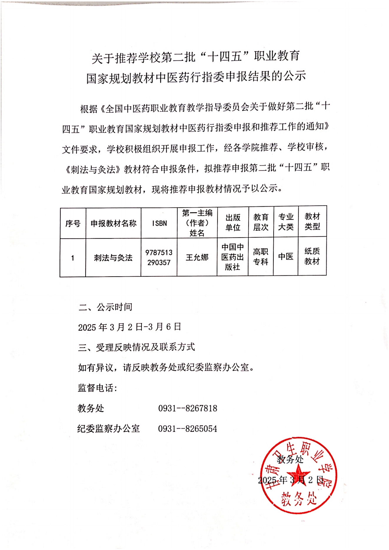 关于推荐学校第二批“十四五”职业教育国家规划教材中医药行指委申报结果的公示