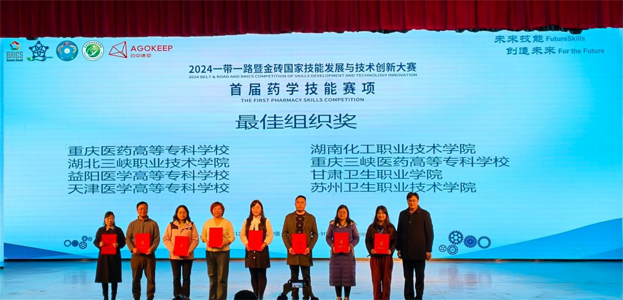 12月6日至9日,“2024一带一路暨金砖国家技能发展与技术创新大赛”首届药学技能赛项在重庆医药高等专科学校圆满落幕。来自全国27个省、自治区、直辖市77所本、专科院校的77名选手同台竞技。经过激烈角逐,开元官网药学院选手杨文璐凭借深厚的专业知识功底、出色的临场表现,以总分第六名的优异成绩脱颖而出,荣获金奖,赵小芳老师获优秀指导老师奖,学校获最佳组织奖。