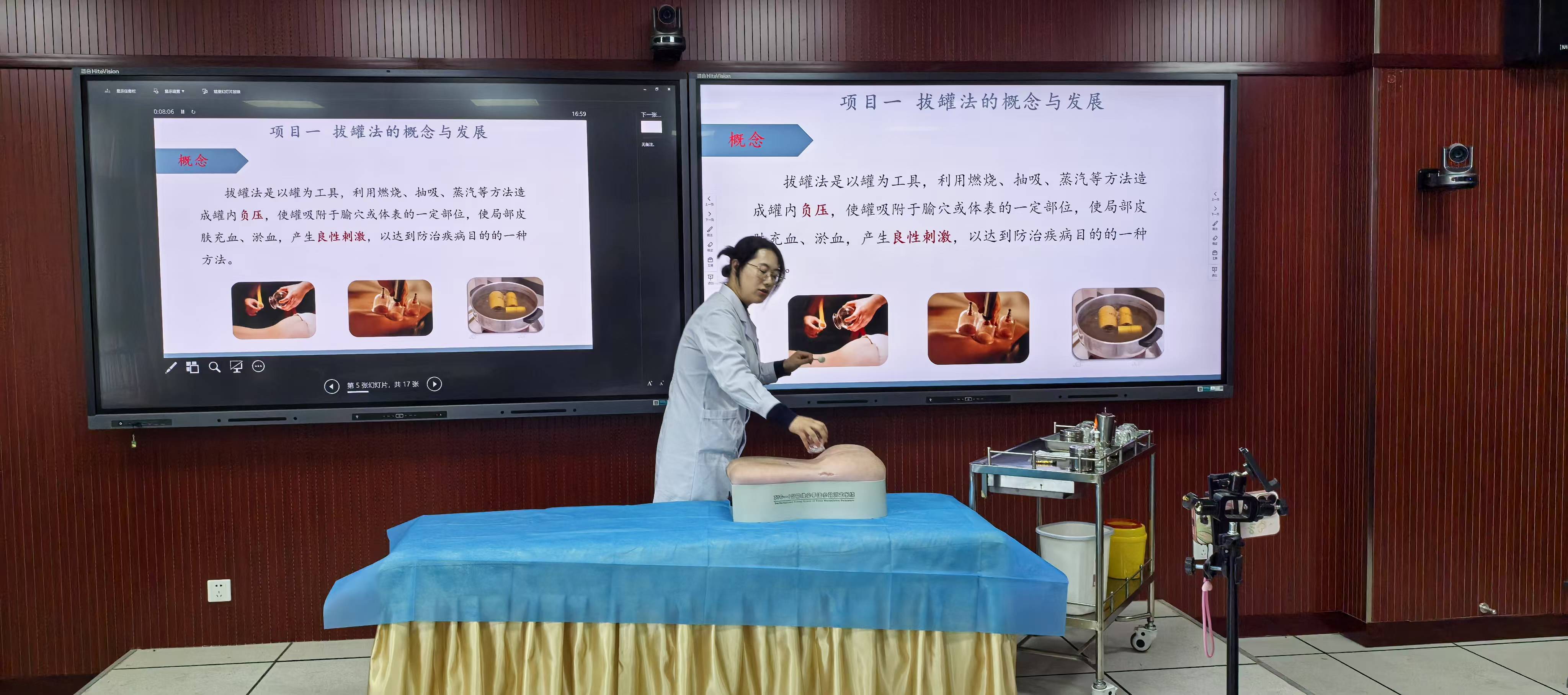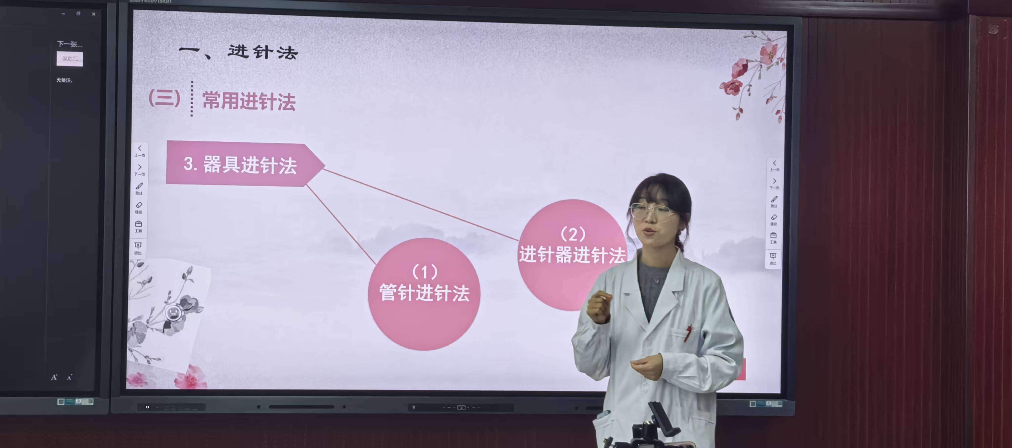 试讲教师安惠、吴巧珍、周娜分别就各自的专业课程进行试讲展示。安惠老师试讲《中医诊断学》课程,以“望神”为主题,采用视频导入,深入浅出地讲解了中医望诊中观察患者精神状态的重要性及具体方法,案例讲解细致入微,风格亲切自然,语言流畅。吴巧珍老师试讲《针灸学》课程,她以“进针手法”为切入点,详细阐述针灸治疗中进针手法和注意事项,示范了多种进针手法,展示出娴熟的技能操作及扎实的理论功底。周娜老师试讲拔罐操作,现场演示拔罐的具体操作流程和注意事项,操作规范,动作流程。