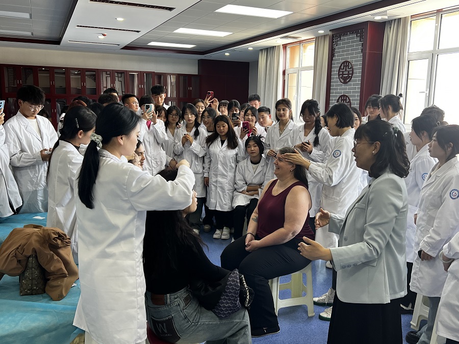 会后,在学校副校长邱文云、国际交流中心、临床护理学院、中医药学院负责人的陪同下,嘉宾先后参观了临床护理学院和中医药学院。在中医实训室饶有兴致地体验了画经点穴、推拿按摩等中医项目,与正在上课的学生一同体验了实训课。来宾对学校的办学条件及办学理念给予了高度赞赏和充分肯定。学校对光华国际教育联合会、加拿大诺奎斯特学院一行提供的合作项目及合作意向表示感谢,也期待双方能有更加紧密深入的合作,助力学校高质量发展。