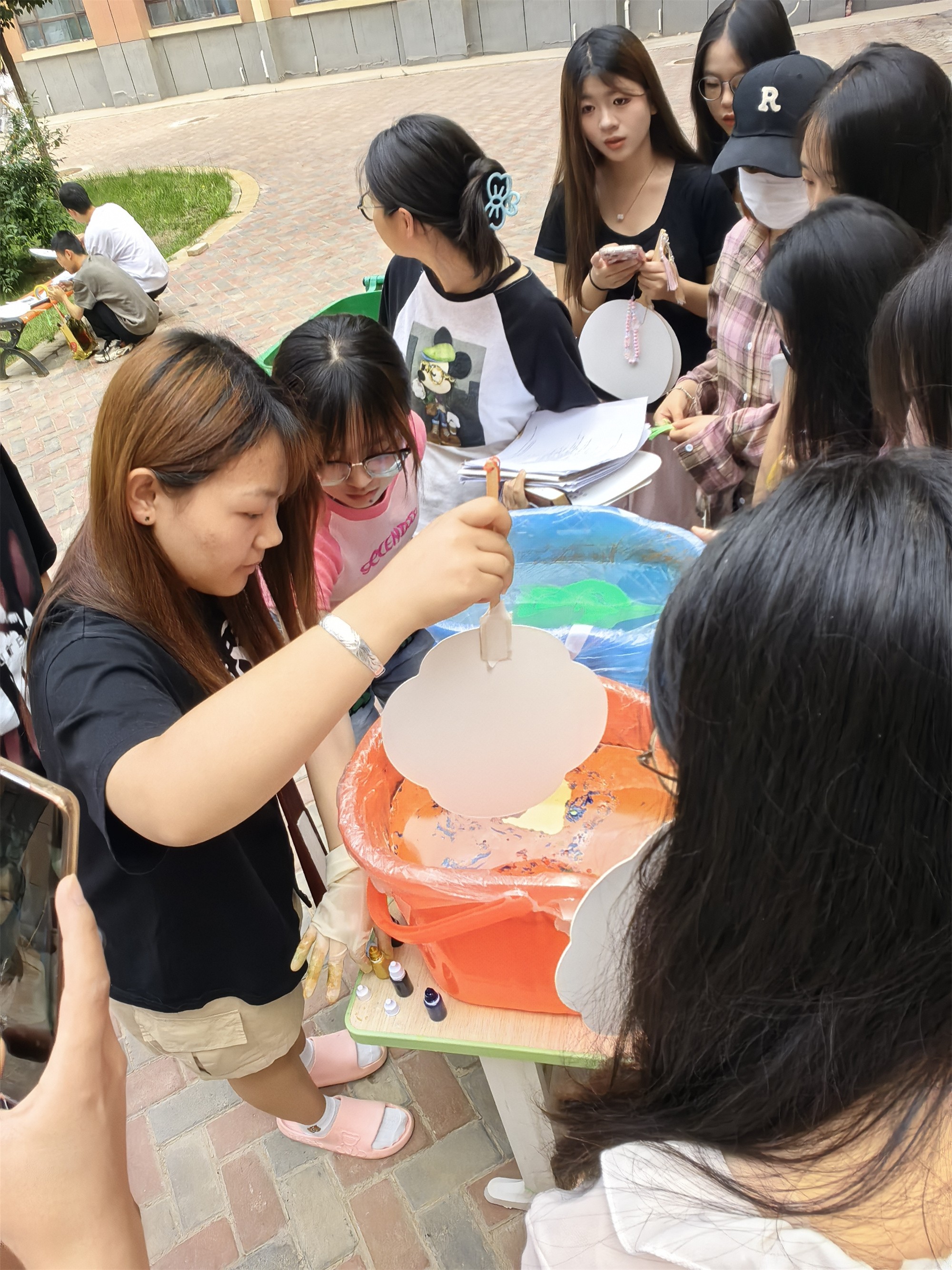 活动过程中同学们对大漆颜色的调配非常感兴趣,每个人抱着激动且忐忑的心情,把漆颜料轻轻滴到水里,待形成漆膜后把扇子逐步插入水中,通过不同技法形成不同效果的漆扇纹理,每位同学都争先恐后的制作属于自己独一无二的漆扇作品,每个人都沉浸在大漆技艺带来的乐趣和成就感之中。
