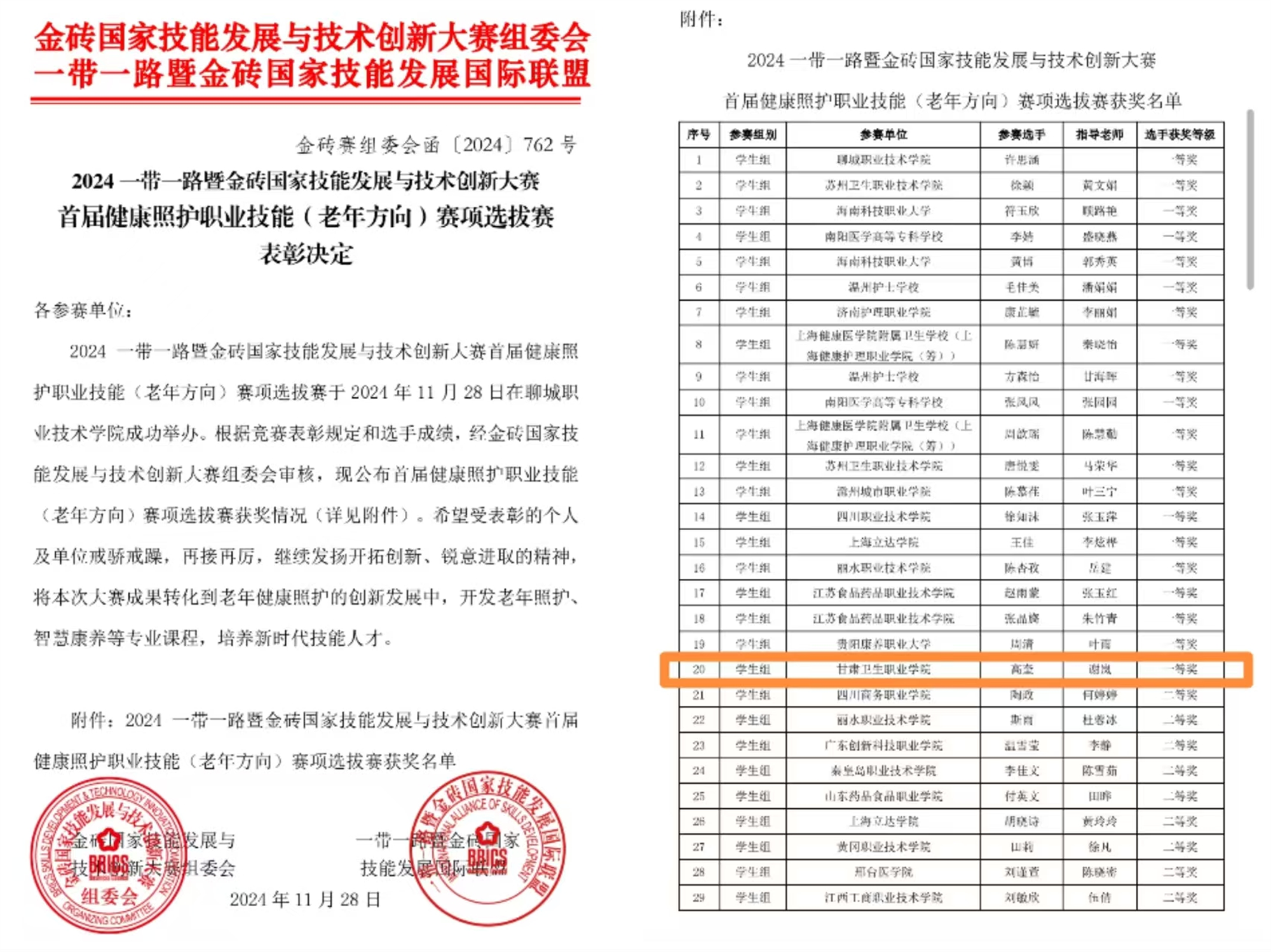 11月26日至12月1日,“2024一带一路暨金砖国家技能发展与技术创新大赛”首届健康照护职业技能(老年方向)赛项选拔赛在山东聊城职业技术学院举办。开元官网护理学院派出的高奎同学凭借扎实的专业技能和出色的临场表现,在来自全国25个省、自治区和直辖市111所院校的363名选手(包括3名国际选手)中名列第20名,荣获选拔赛一等奖。