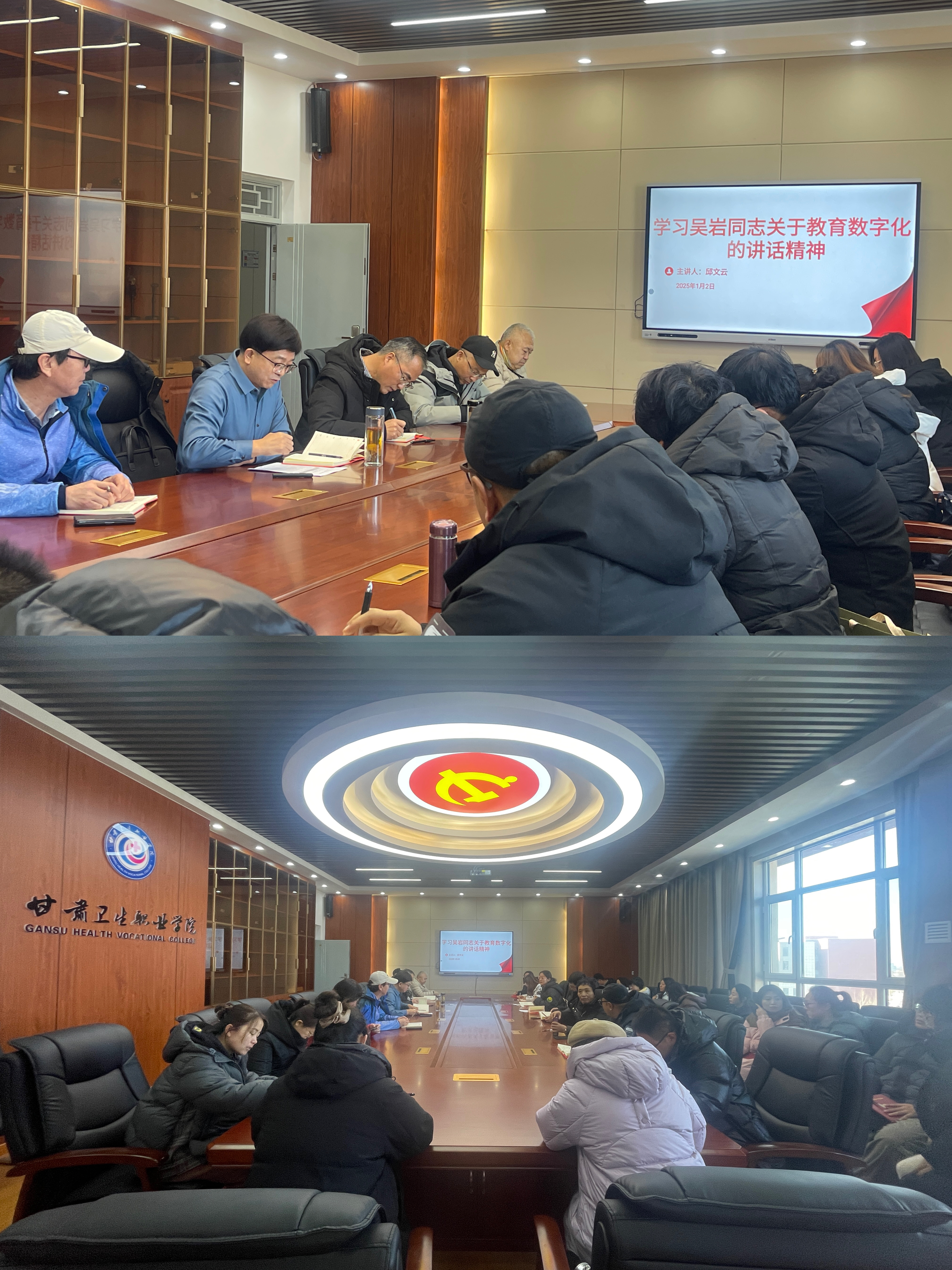 2025年1月2日中午,公共教学部教师党支部组织开展2025年第一季度党员大会、主题党日和党课活动,特别邀请邱文云副校长为支部党员讲授了一堂内容丰富、意义深刻的专题党课。公共教学部全体党员参与此次学习活动。