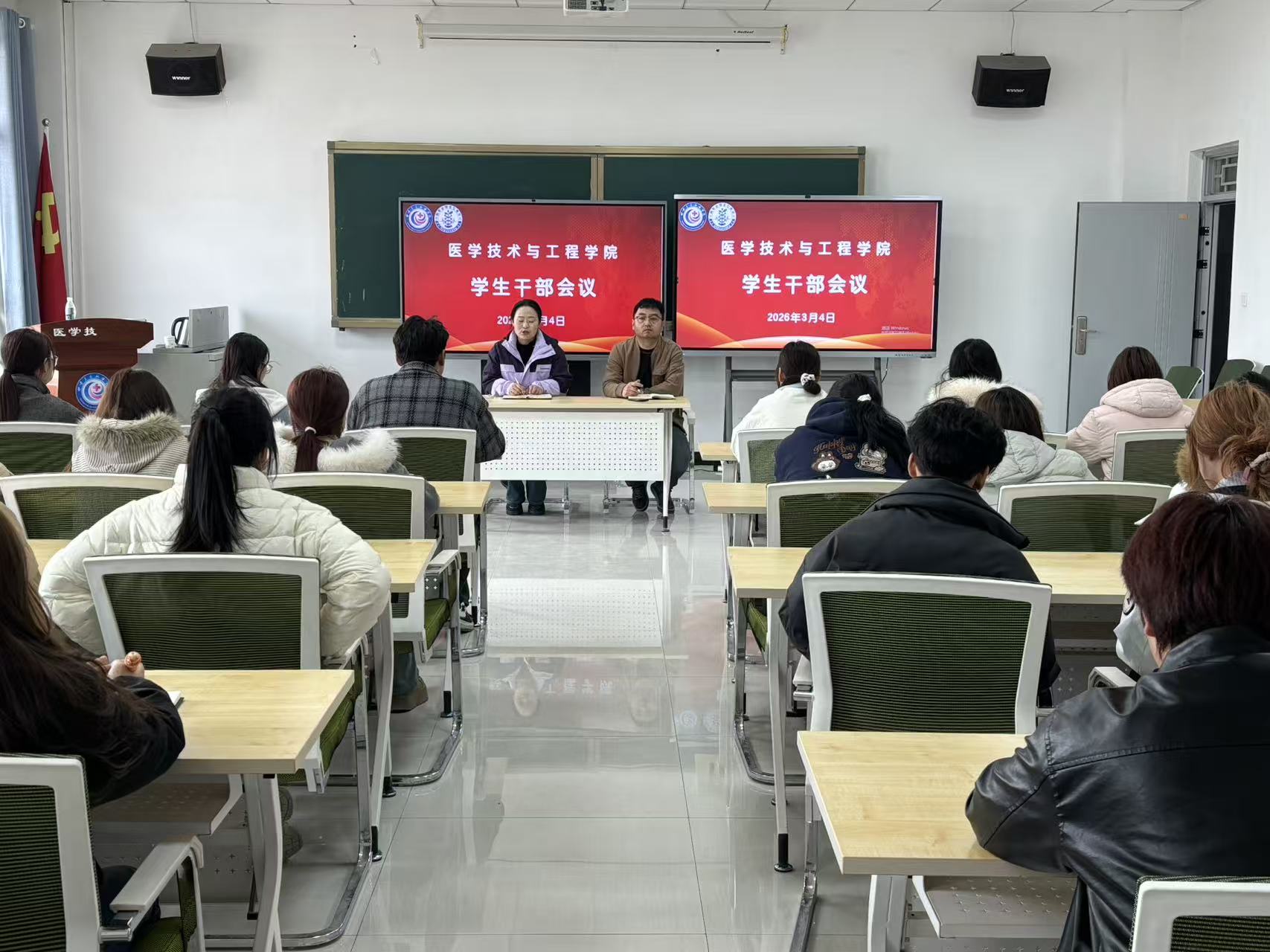 2026年3月4日下午,医学技术与工程学院召开新学期学生干部工作会议。学院党总支副书记、学工办负责老师及全体团学干部、各班班长、团支书、学习委员参加会议。