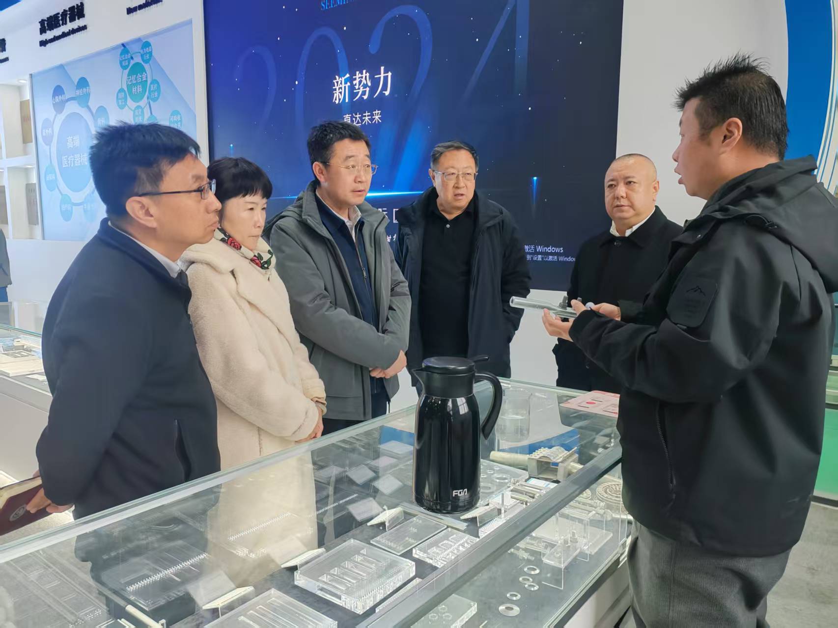 王建成一行实地参观了企业生产厂区,西脉集团总经理马韬麟、常务副总经理苏金霞、副总经理唐琰等陪同。参观中,工作人员详细讲解并演示了集团研发的记忆合金、可降解医疗新材料,以及康复训练仪、盆底肌训练仪等医疗器械。