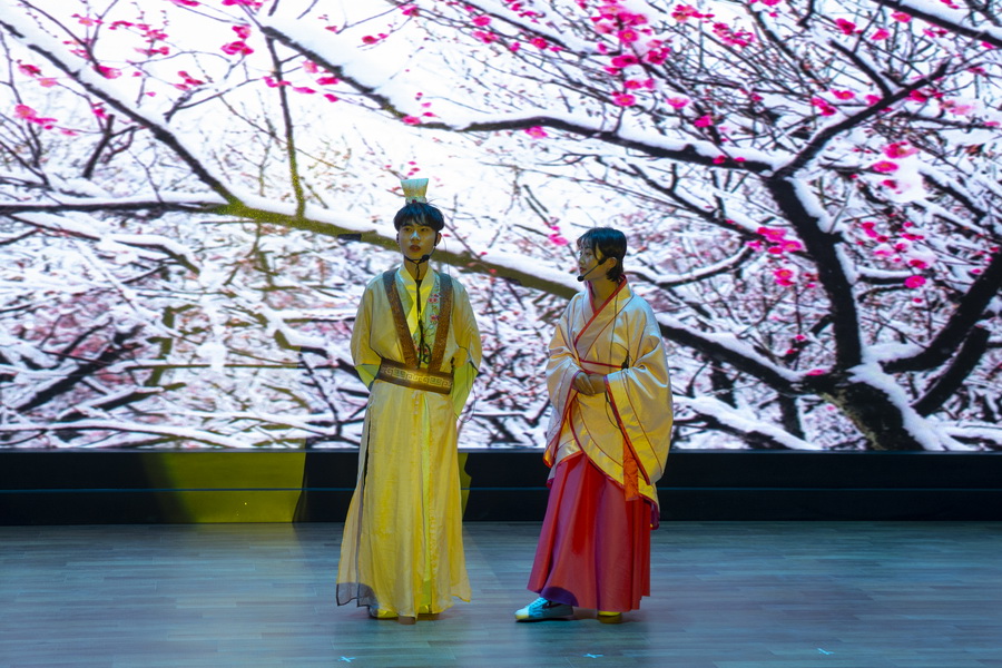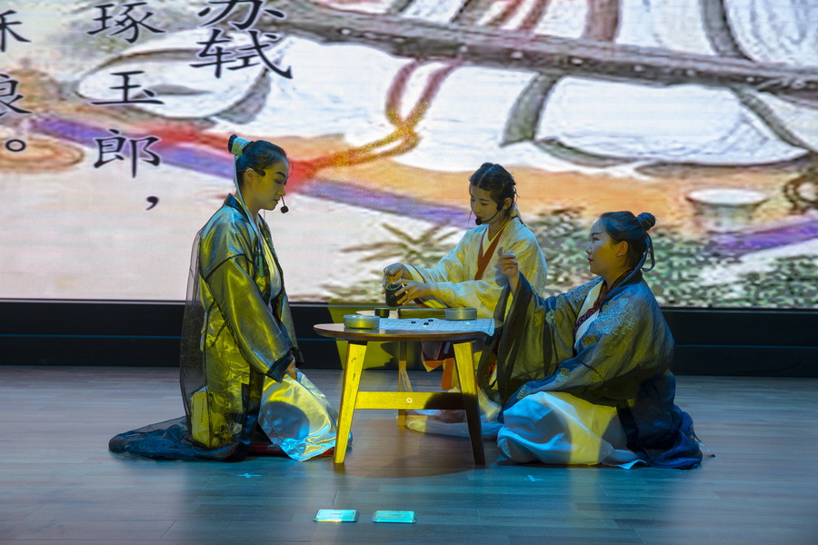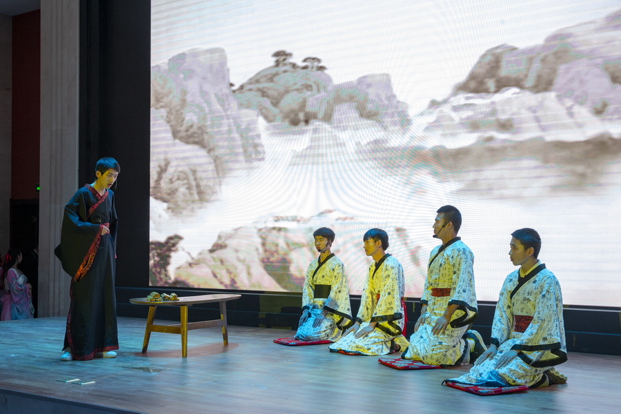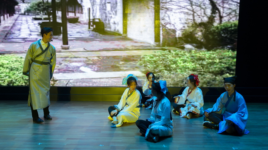 生死篇,古道人来人往,穿梭衣的男子在阡陌小路上行走,清明的异乡恰逢清明雨,思起故乡,黄土衰草,满心愁情不如清酒一壶,此时,杜牧问了小童;庄子与学生在学堂论道;“劝君莫惜金缕衣,劝君惜取少年时”侬侬软语在女娇娥的轻歌曼舞里;生命开出绚烂花最终绽放在“苔花如米小,也学牡丹开”的傲然中。与会嘉宾在《苔》的歌声中合影留念,记录美好光阴。