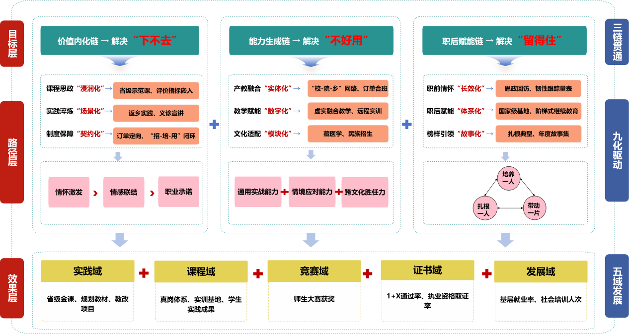 本成果遵循“问题导向、岗位适配、全链贯通”理念,创新性构建“三链贯通·九化驱动·五域发展”的全链条人才培养模式。该模式以“价值内化链”破解职业认同难题,通过浸润式思政、场景化实践和契约化制度,引导学生扎根基层;以“能力生成链”破解学用脱节难题,通过实体化产教融合、数字化教学赋能和体系化文化适配,锻造学生胜任基层工作的过硬本领;以“职业发展链”破解成长断层难题,通过长效化情怀培育、续航化职后赋能和故事化榜样引领,支持人才在基层可持续发展。其核心创新在于实现了人才培养从阶段性“技能供给”向全周期“人才成就”的战略跃迁,并开辟了契合多民族地区实际的“文化适配”培养新路径。