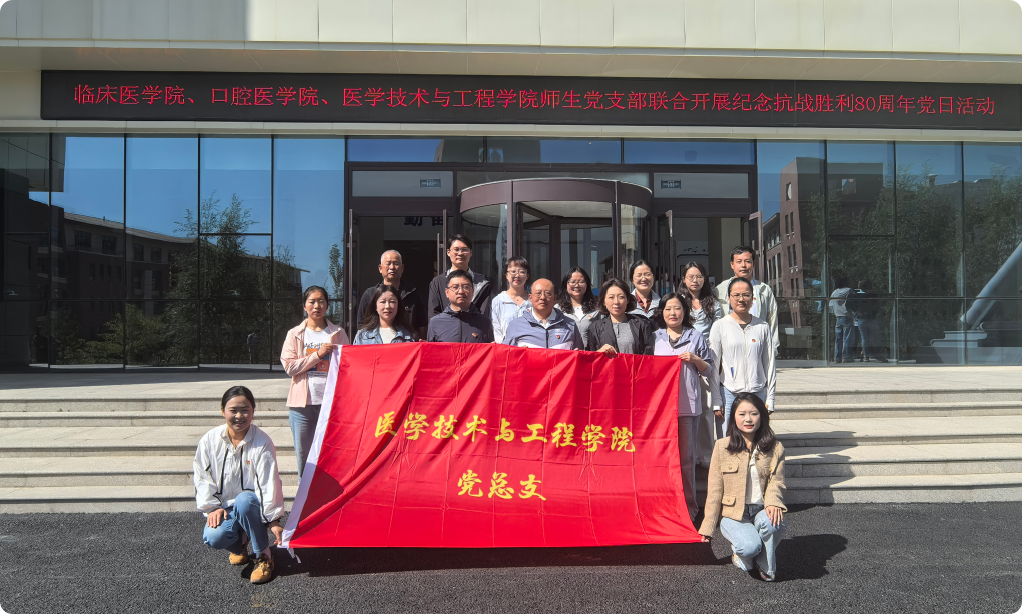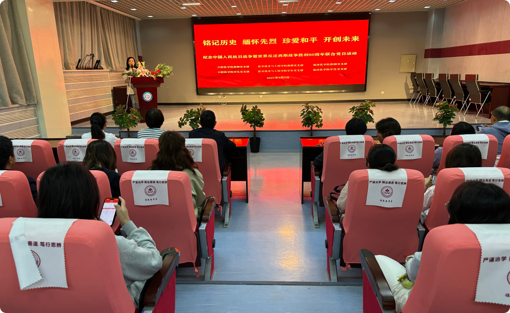 为铭记历史、缅怀先烈,传承和弘扬伟大抗战精神,9月3日上午,医学技术与工程学院与临床医学院、口腔医学院在求恩楼一楼学术报告厅联合开展纪念中国人民抗日战争暨世界反法西斯战争胜利80周年主题党日活动。
