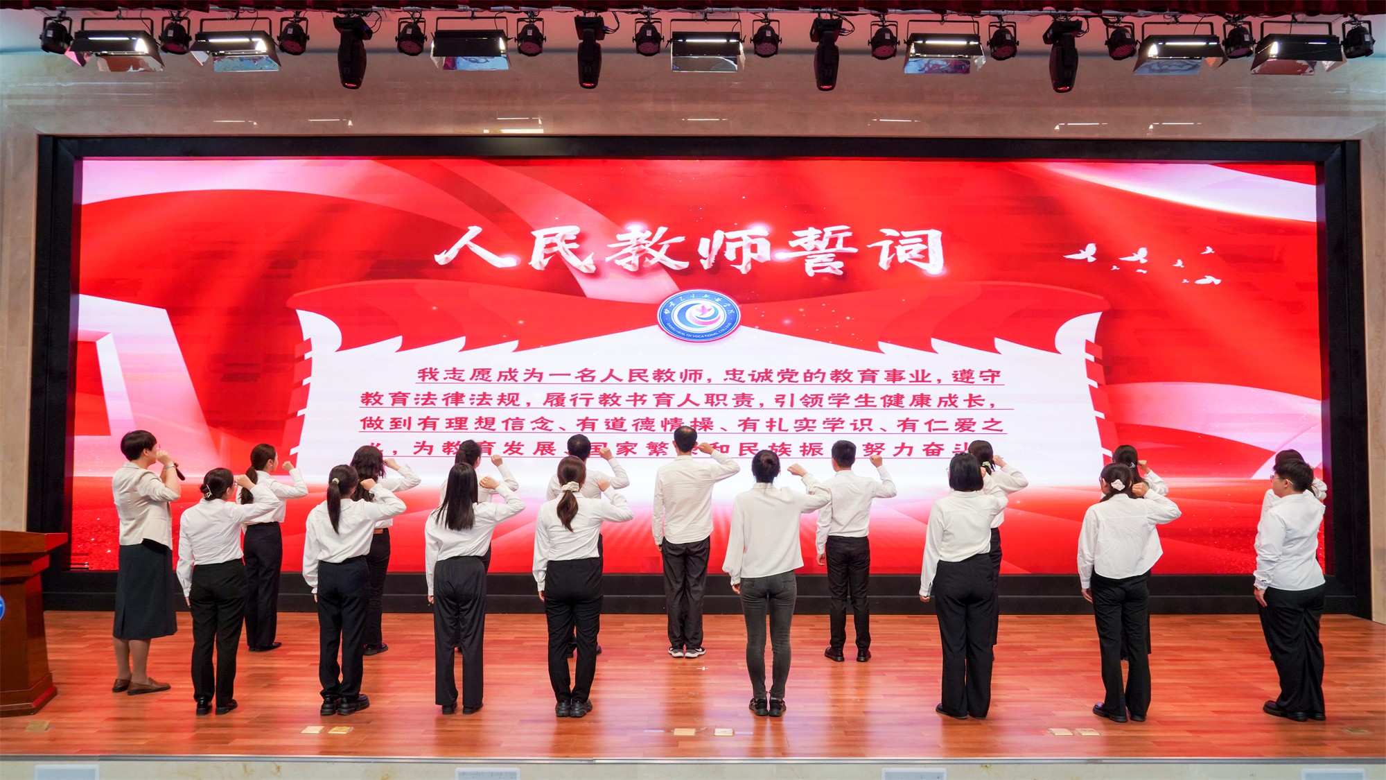大会举行了新教师入职宣誓仪式,17名新入职教师在庄重而温馨的氛围中依次上台,临床医学院院长寇桂香教授作为老教师代表为新教师领誓,与会校领导为新入职教师授校徽和工作服。现场响起热烈的掌声,欢迎新同事加入卫职院大家庭,共同投入到学校建设发展的光荣事业中。