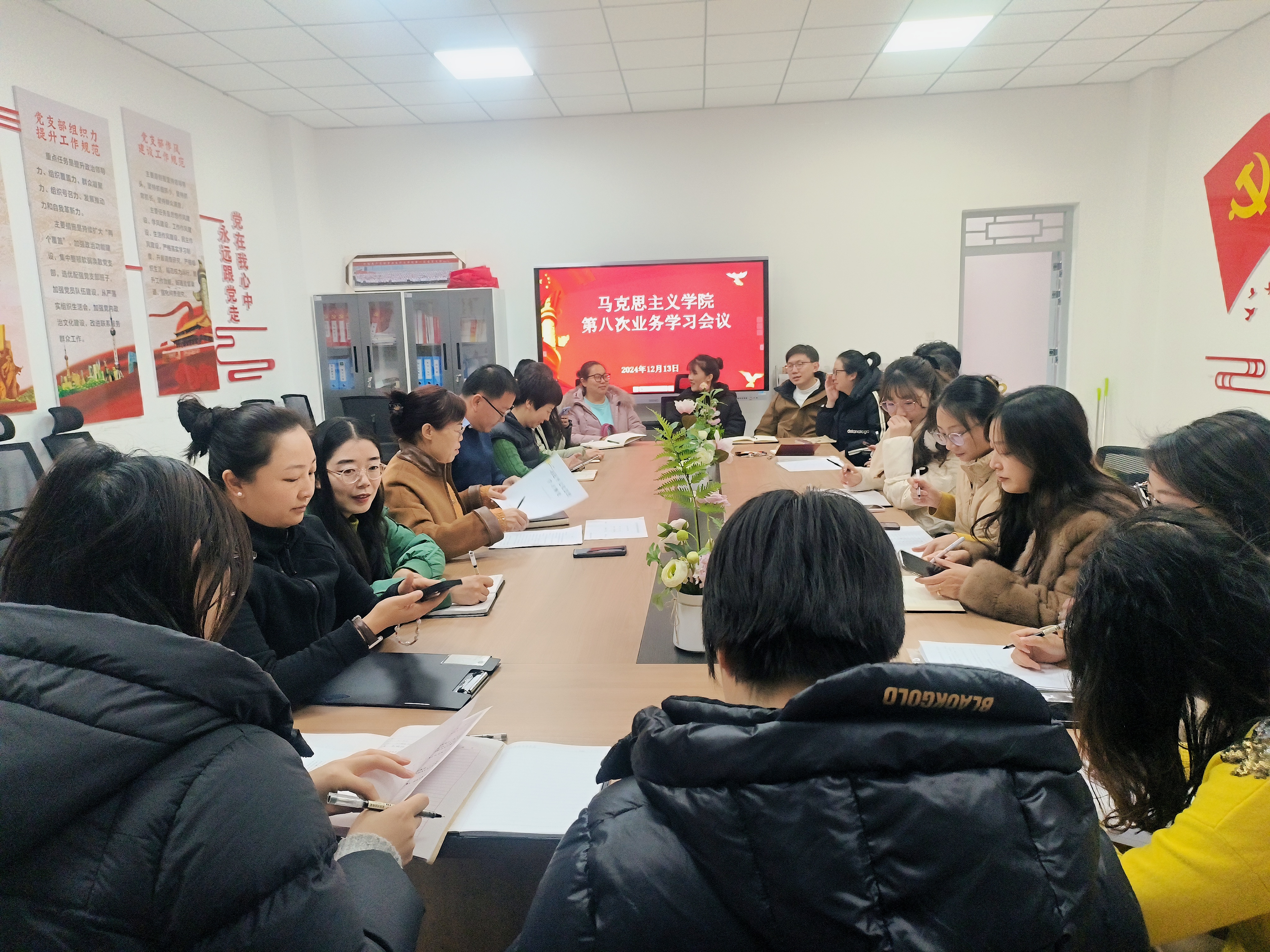 为深入推进习近平新时代中国特色社会主义思想入脑入心,全面提升思政课教师教学能力,进一步提高思政课教学质量,12月13日下午,马克思主义学院在学院503党员活动室召开2024年度第八次业务学习会议,专题学习《习近平文化思想学习纲要》,马克思主义学院全体专兼职教师参加会议,会议由马克思主义学院院长赵晓玲主持。
