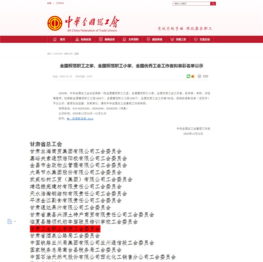 2020年底,在中华全国总工会组织的全国模范职工之家评选活动中,经甘肃省教科文卫工会选拔、推荐,KY开元集团官网工会被授予“全国模范职工之家”称号。