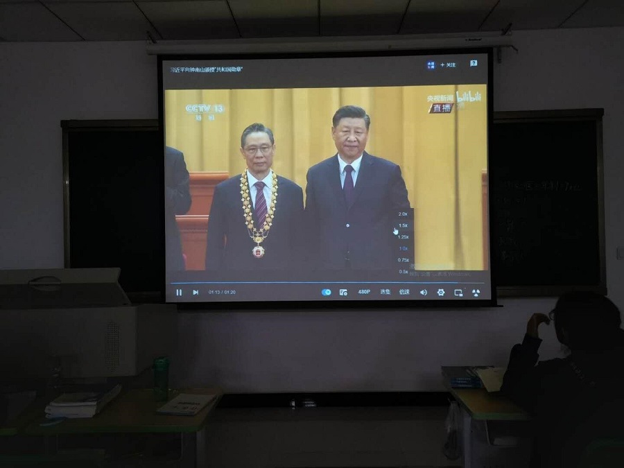 9月8日上午,全国抗击新冠肺炎疫情表彰大会在北京人民大会堂隆重举行,中共中央总书记、国家主席、中央军委主席习近平向国家勋章和国家荣誉称号获得者颁授勋章奖章并发表重要讲话。为了学习习近平总书记所诠释的生命至上、举国同心、舍生忘死、尊重科学、命运与共的伟大抗疫精神, 9月13日至22日,学生工作处和校学生会联合组织学校全体学生在各班教室观看《抗击疫情表彰大会》。