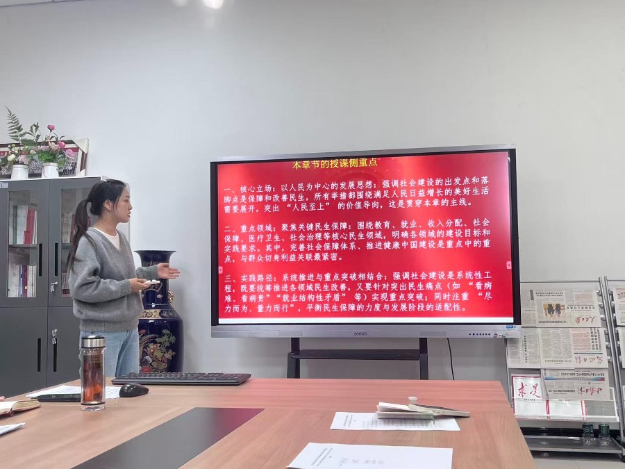 备课会上,大家集体学习了《中共中央关于制定国民经济和社会发展第十五个五年规划的建议》《关于<中共中央关于制定国民经济和社会发展第十五个五年规划的建议>的说明》,会议强调,学习好贯彻好党的二十届四中全会精神是当前和今后一个时期全党全国重大政治任务,要发挥好思政课堂主渠道作用,推动全会精神进教材、进课堂、进头脑。随后,关思宁老师就第十一章《以保障和改善民生为重点加强社会建设》进行了教学展示。最后,与会教师就“融什么”“怎么融”进行了深入的研讨。大家一致认为,党的二十届四中全会内涵丰富、意义重大,要扎实学习全会精神,积极将其转化为教学素材,同时结合医学生实际,不断提升思政课的实效性和吸引力。
