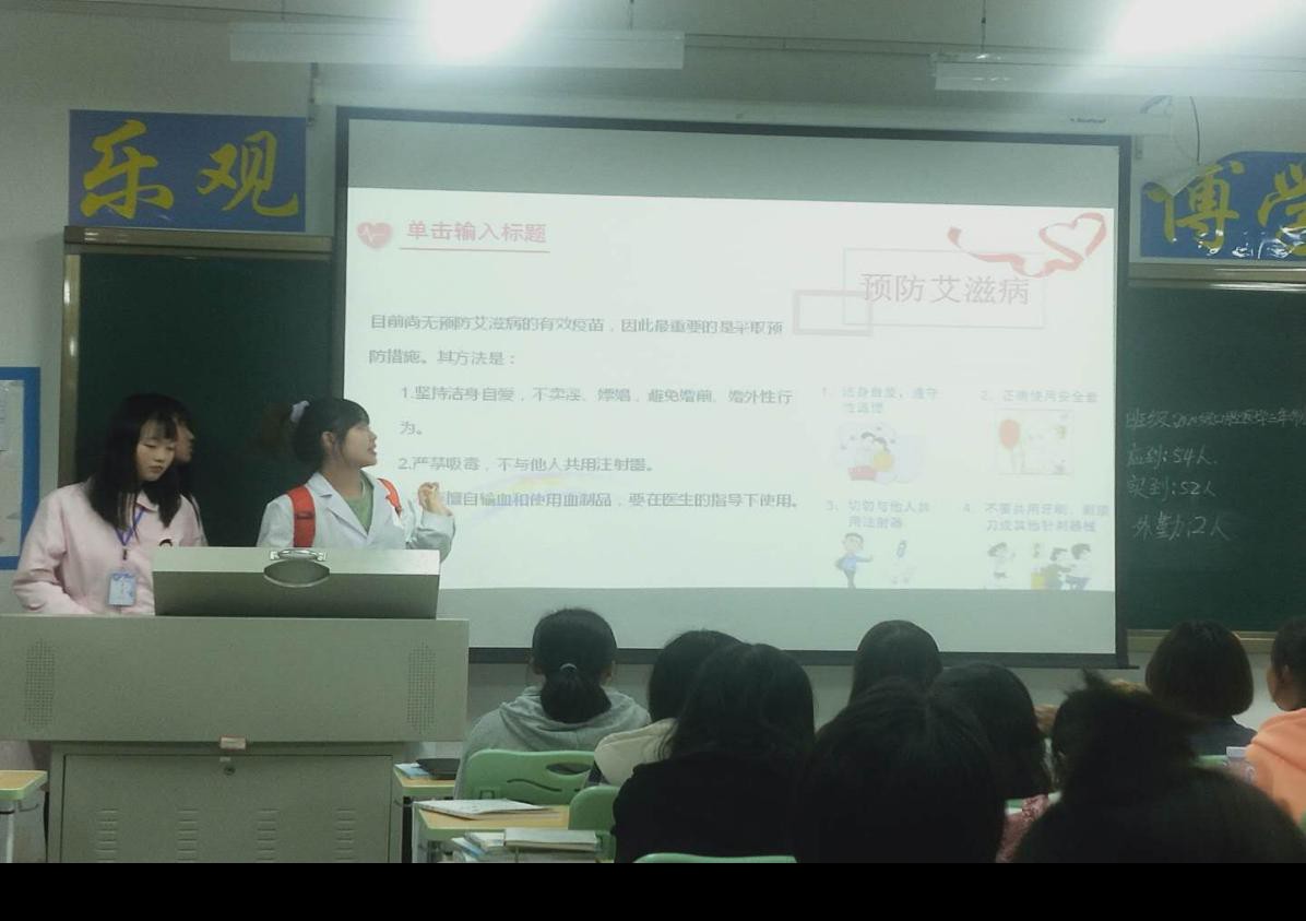 此次班会由附属医院两位主任主持,天使爱心社社员们及附属医院老师对各班进行了艾滋病相关知识宣传及健康教育。主要通过讲解艾滋病相关知识ppt、观看视频等方式,为大家普及什么是艾滋病、艾滋病的目前概况、艾滋病的传播途径和危害,提高同学们预防艾滋病的意识和自我防护能力。