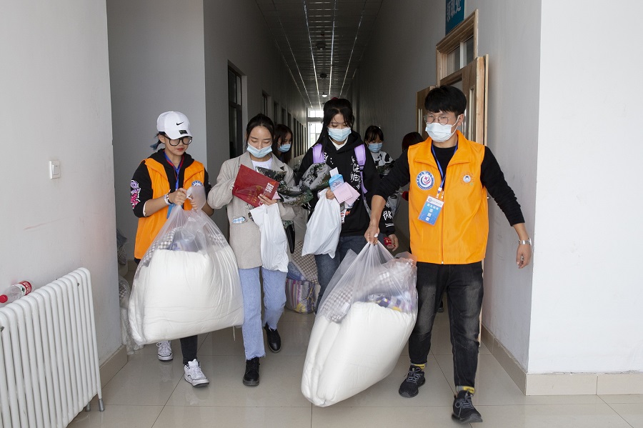 报到期间,学校专程在火车东站、火车西站、新区职教园区汽车站设置了校外迎新点,为新生和家长提供便捷的接送服务。根据疫情防控工作的需要,新生在校门口排队有序进行体温检测、身份核查、健康码核查、行李消杀后进入校园。各二级学院分别设立了迎新报到处,为新生办理报到手续、发放报到材料、帮忙托运行李、为新生答疑解惑等,用贴心的服务让新生感受到家的温暖。在工作人员与志愿者的热情引导和帮助下,新生们顺利完成了报到、分班、缴费、智慧校园卡和卧具的办理领取等一系列报到流程。