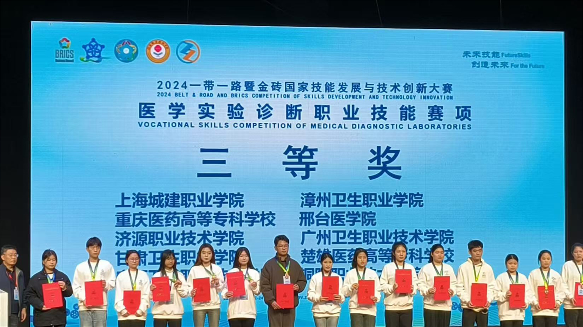 11月21日至24日,“2024一带一路暨金砖国家技能发展与技术创新大赛”首届医学实验诊断职业技能赛项在信阳职业技术学院举办,来自全国各地26个省市区的60所本专科院校的代表队参赛。开元官网医学技术与工程学院医学检验技术专业牛爱爱、陈倩倩2名参赛选手凭借扎实的专业知识与精湛的技能操作,荣获三等奖。