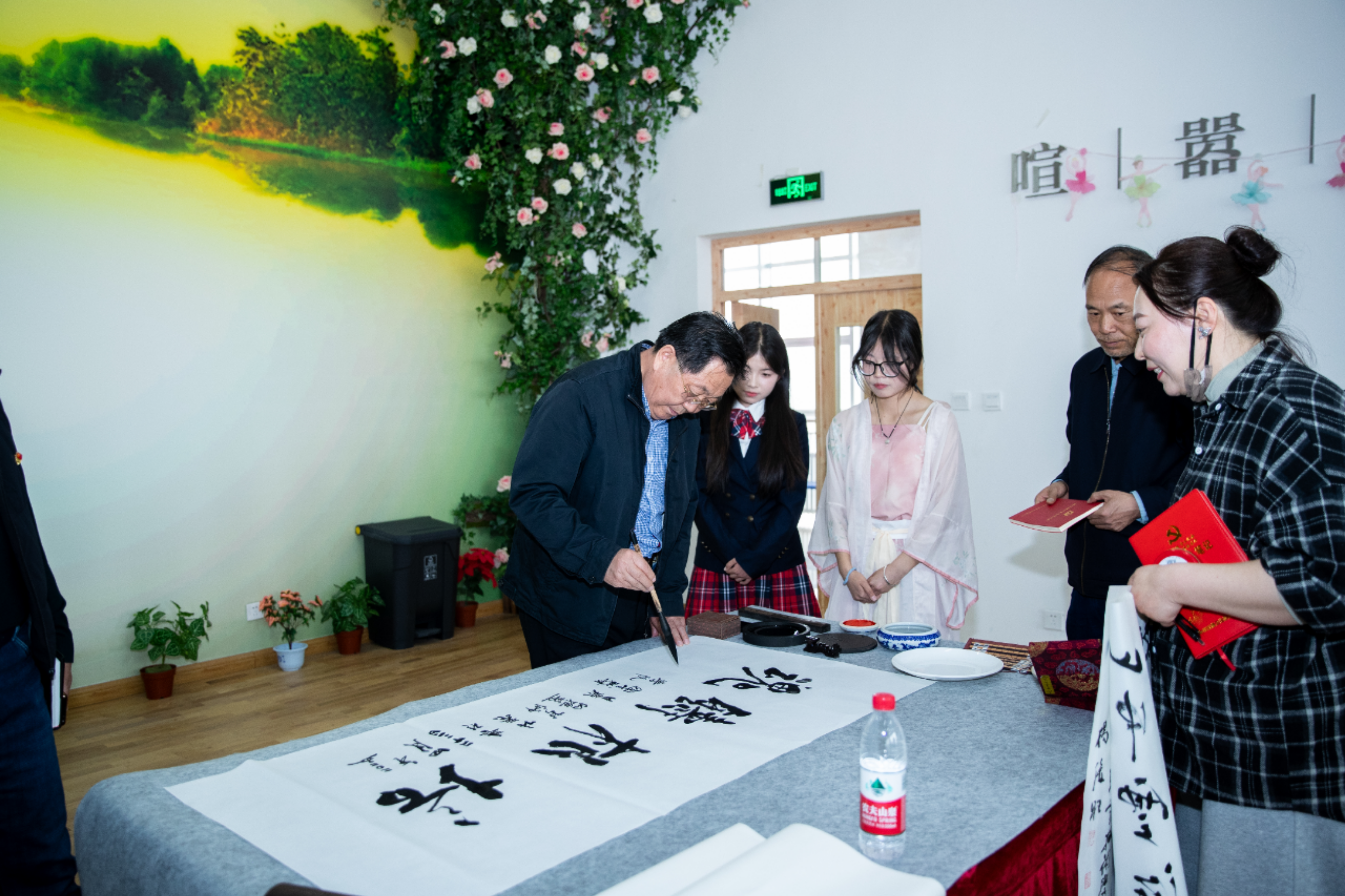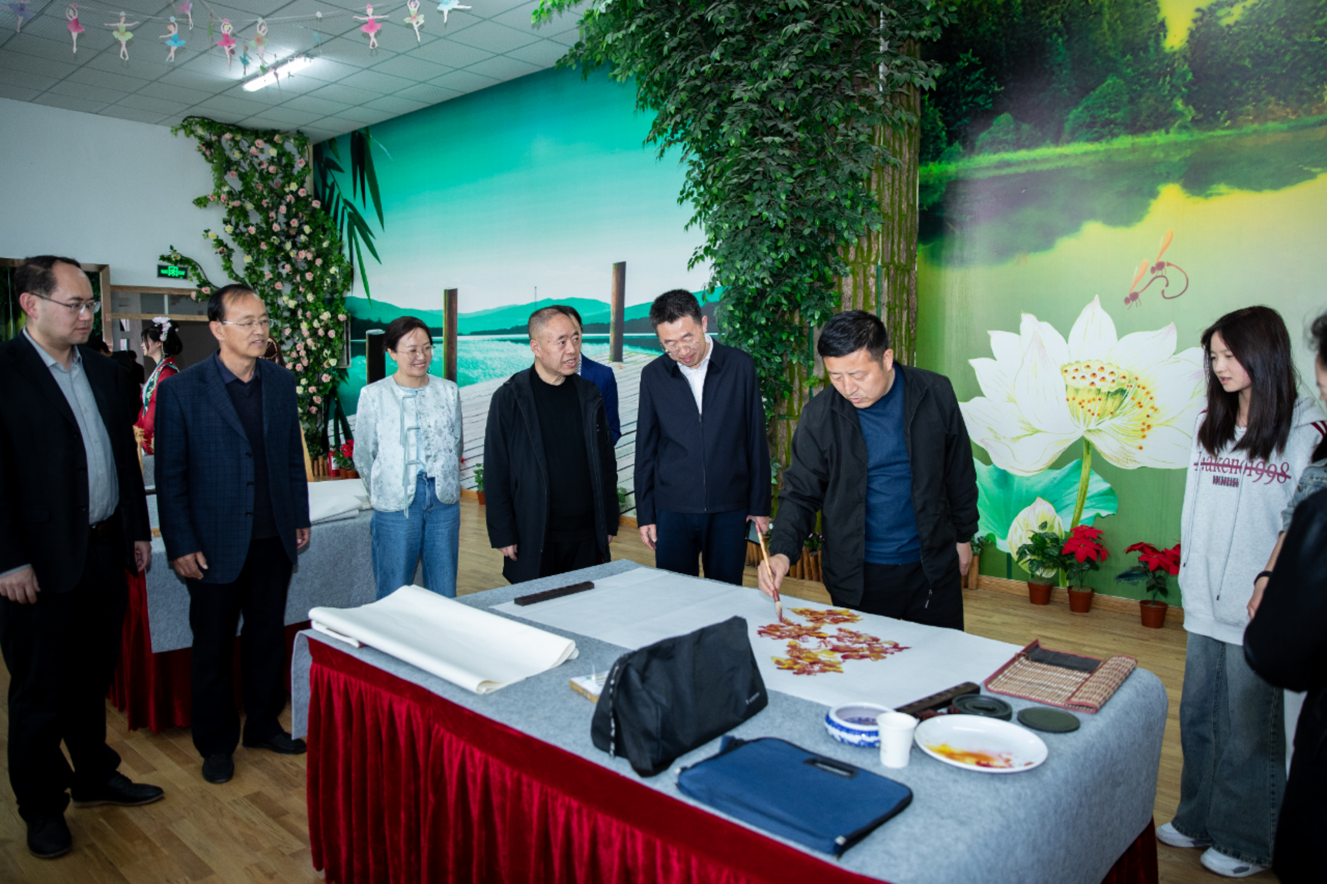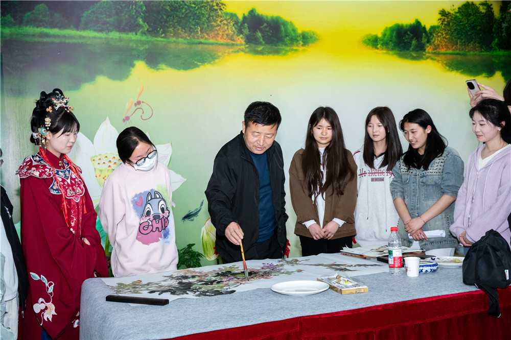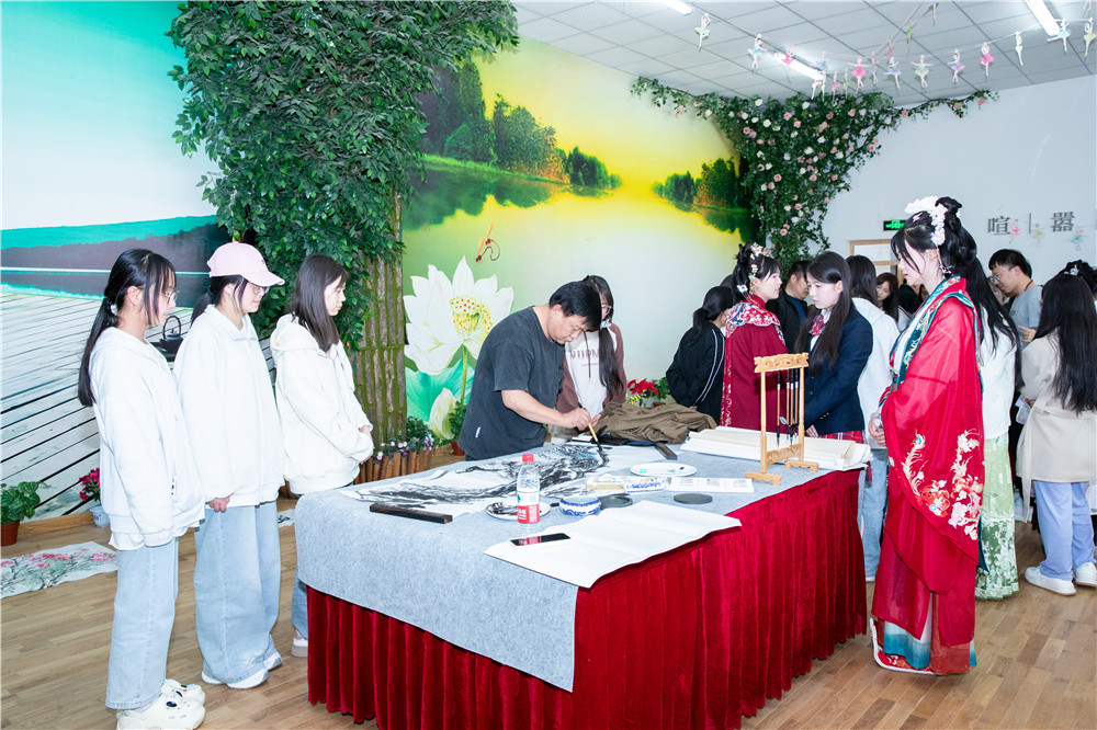 随后,书画名家与师生书画爱好者进行现场创作活动。书画家们挥毫泼墨,笔走龙蛇。书法作品或苍劲有力,或飘逸灵动,书写出中华经典诗词的韵味;绘画作品则栩栩如生,花鸟鱼虫跃然纸上,山水意境引人入胜。他们精湛的技艺不仅展现了传统书画艺术的魅力,更让在场师生近距离感受到了中华文化的博大精深。在创作过程中,嘉宾们还与师生亲切互动,耐心讲解书画技巧和文化内涵,指导学生进行尝试创作。学生们热情高涨,纷纷拿起笔墨,在嘉宾的指导下认真书写、绘画,现场气氛热烈而融洽。