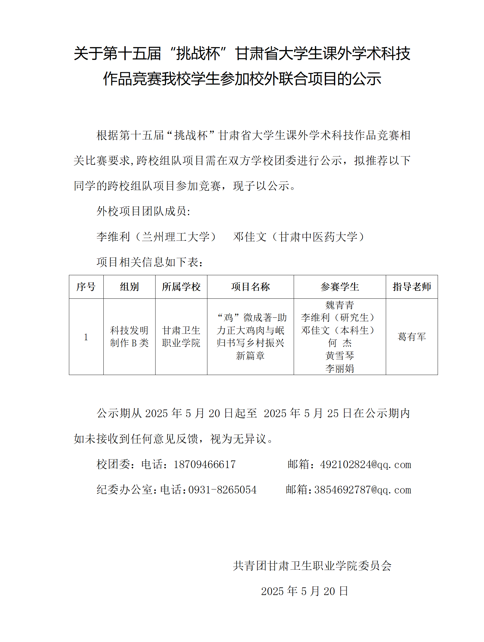 关于第十五届“挑战杯”甘肃省大学生课外学术科技作品竞赛开元官网学生参加校外联合项目的公示