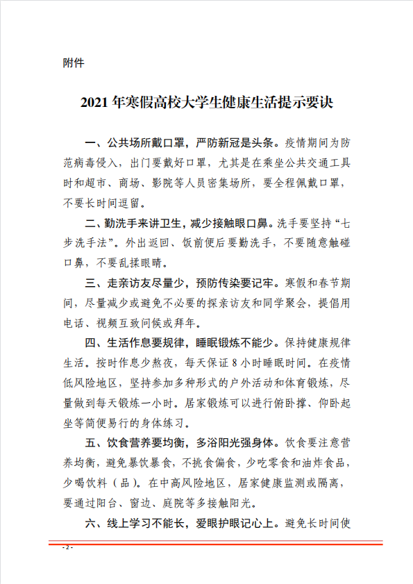 关于印发《2021年寒假高校大学生健康生活提示要诀》的通知