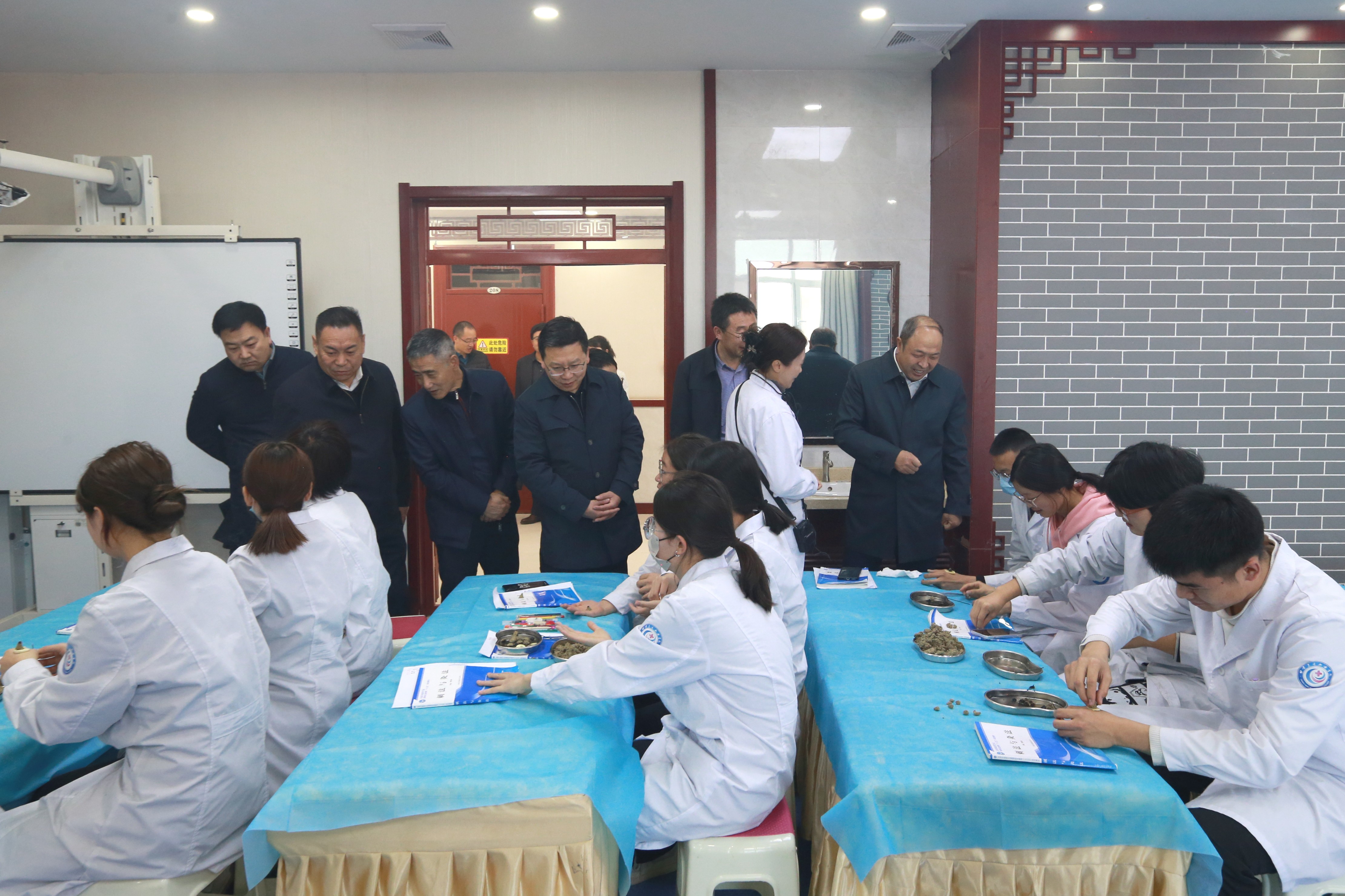 张国珍一行在包磊、王建成的陪同下环校园步行,实地查看校园环境,了解校舍规划及学生校园生活。随后在中医药学院深入了解实训教学情况,分别在校企合作模拟药房、中药材展览馆、中药炮制实训室、药理实训室、药物分析实训室、中药制剂实验室、中医药文化博览馆、中医推拿实训室、画经点穴实训室、拔罐艾灸实训室、藏医药产业学院等多个实训室及教学场所考察调研,并走进中药制剂、艾灸、推拿按摩、画经点穴等实训课堂,深度参与教学活动,与师生互动。中医药学院院长杨频教授就中医、中药、药学等专业的师资、基础条件、特色亮点、教学改革方向等情况作了详细介绍。张国珍说,希望学校发挥好实训基地在技能教学、文化熏陶、科普教育等方面的作用,传承发扬好博大精深的中医药文化。