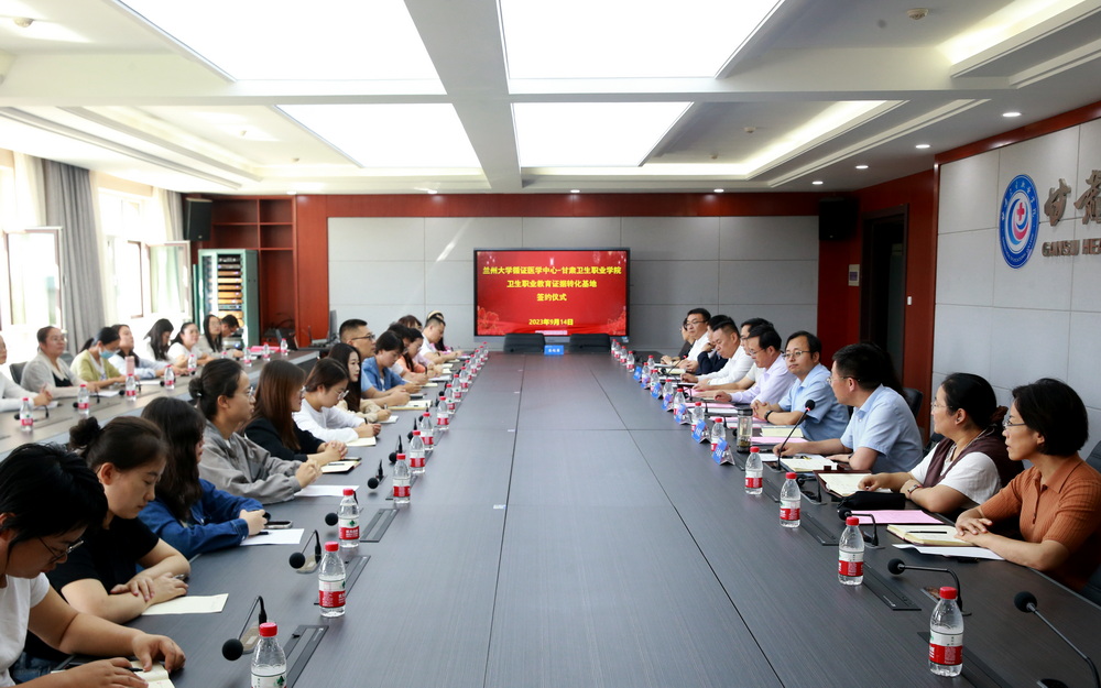 签约仪式上,王建成代表学校对各位专家的到来表示热烈欢迎,并从学校办学历史、教育教学、科学研究、招生就业等方面进行了详尽介绍。田金徽教授围绕团队成员、平台建设、学生教学和科学研究4个方面介绍了兰州大学循证医学中心基本情况。杨克虎教授、田金徽教授和包磊书记、王建成副校长共同为基地揭牌,卫生职业教育证据转化基地正式成立。