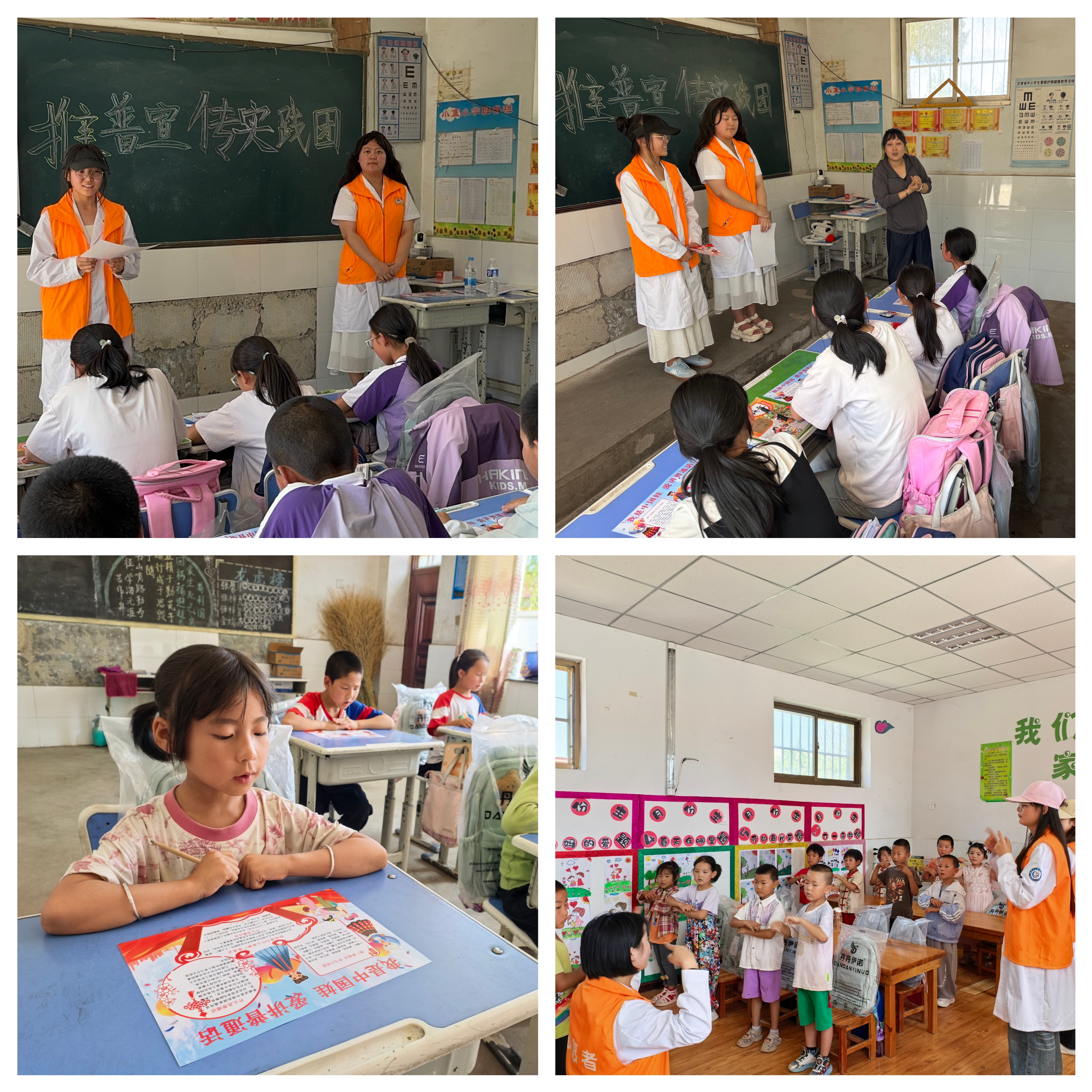 在会宁县头寨子镇小寨子村小学,“推普宣传实践团”的志愿者队员向孩子们分发了推普宣传单,介绍了讲好普通话、写好汉字的重要性,随后带领孩子们开展了“经典诵读”等活动,在孩子们嘹亮的朗读中,队员们针对当地学生平翘舌音混淆、前后鼻音不分等痛点纠正孩子们的发音,引导孩子们正确地讲普通话,激发孩子们学习普通话的兴趣,现场气氛热烈。在小寨子村幼儿园,队员们带领小朋友们唱儿歌、做游戏,通过趣味性强的游戏活动引导小朋友们讲普通话。
